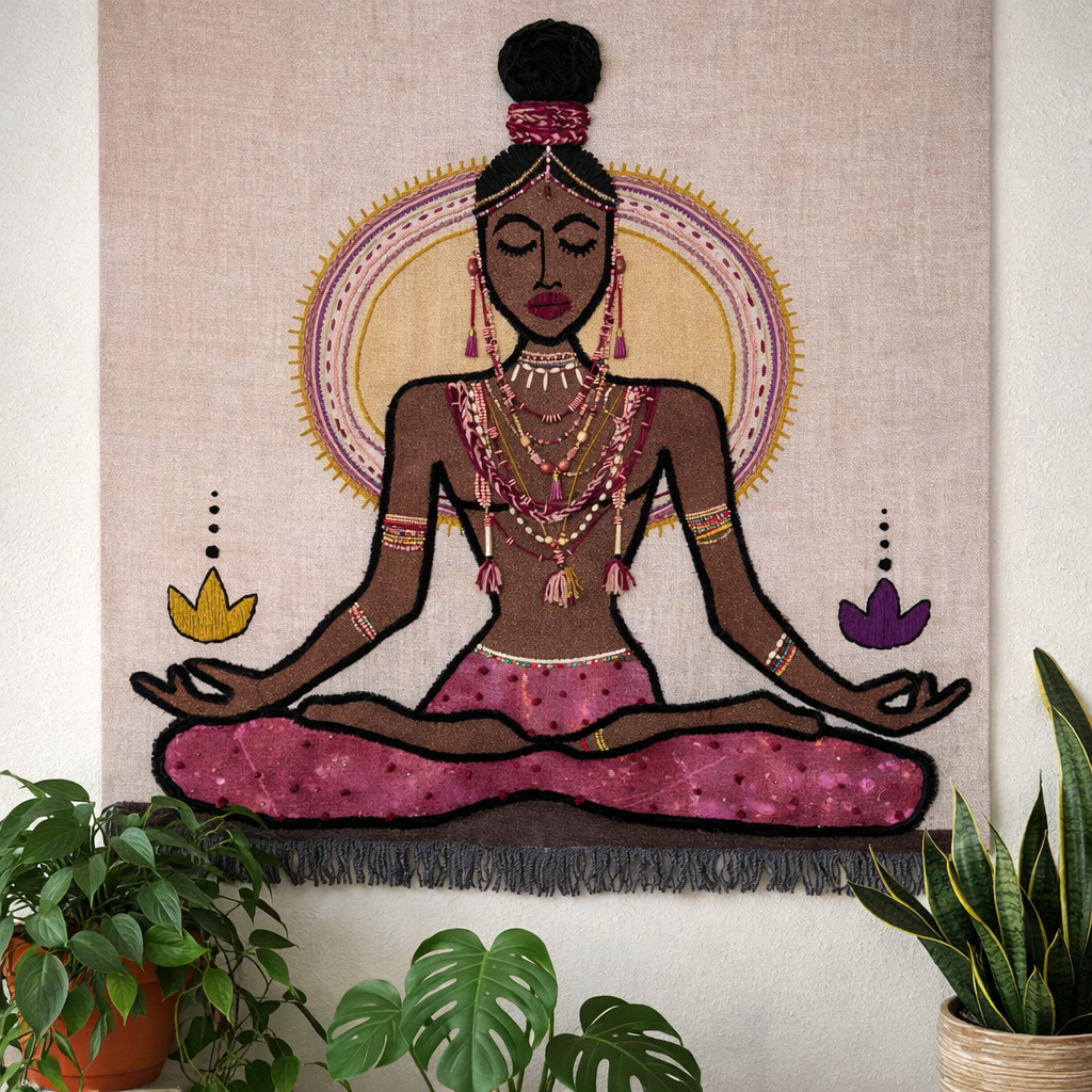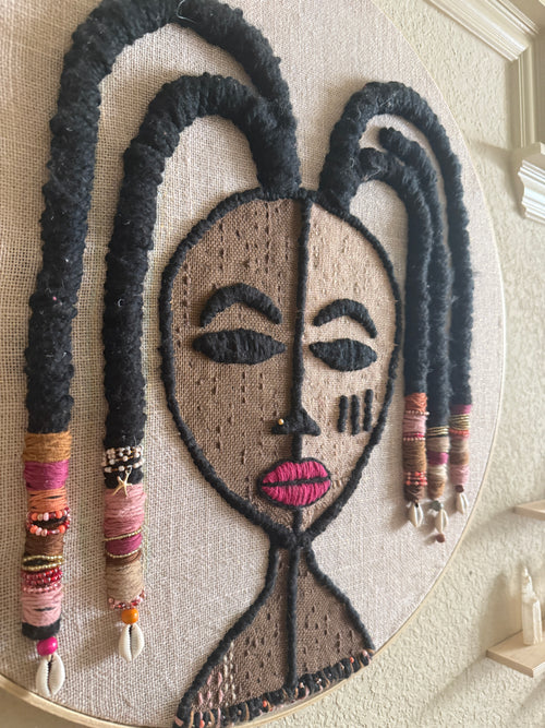 I create symbolic textile portraits rooted in memory, identity, and ancestral rhythm.